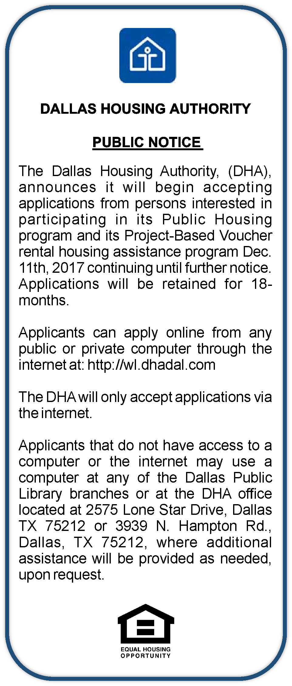 Dallas Housing Authority – Public Notice Share This With Friends: Dallas Housing Authority – Public Notice Share This With Friends: Share This With Friends: Dallas Housing Authority – Public Notice Share This With Friends: